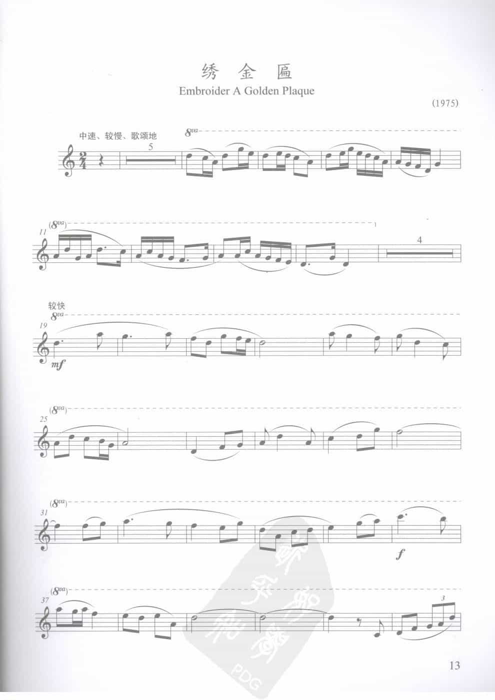 方定昊中国长笛作品集系列之:绣金匾,长笛独奏分谱简谱五线谱附歌词是乐器资源网于2014年04月29日 00:14:40整理更新,内容收录在长笛乐谱栏目;乐器资源网免费分享专业、准确、规范、高清的长笛乐谱简谱五线谱歌词等电子版资料,欢迎在线免费下载;乐器资源网无需注册会员,即可直接免费下载各类乐器学习相关资源。