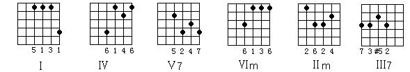 3、 这样我们就可以推出G调在0把位,C调在第四把位,D调在第七把位,E调在第九把位。