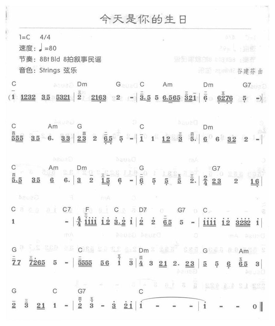 电子琴C大调a小调乐曲【今天是你的生日】简谱带和弦简谱五线谱附歌词是乐器资源网于2017年03月22日 22:31:46整理更新,内容收录在电子琴乐谱栏目;乐器资源网免费分享专业、准确、规范、高清的电子琴乐谱简谱五线谱歌词等电子版资料,欢迎在线免费下载;乐器资源网无需注册会员,即可直接免费下载各类乐器学习相关资源。