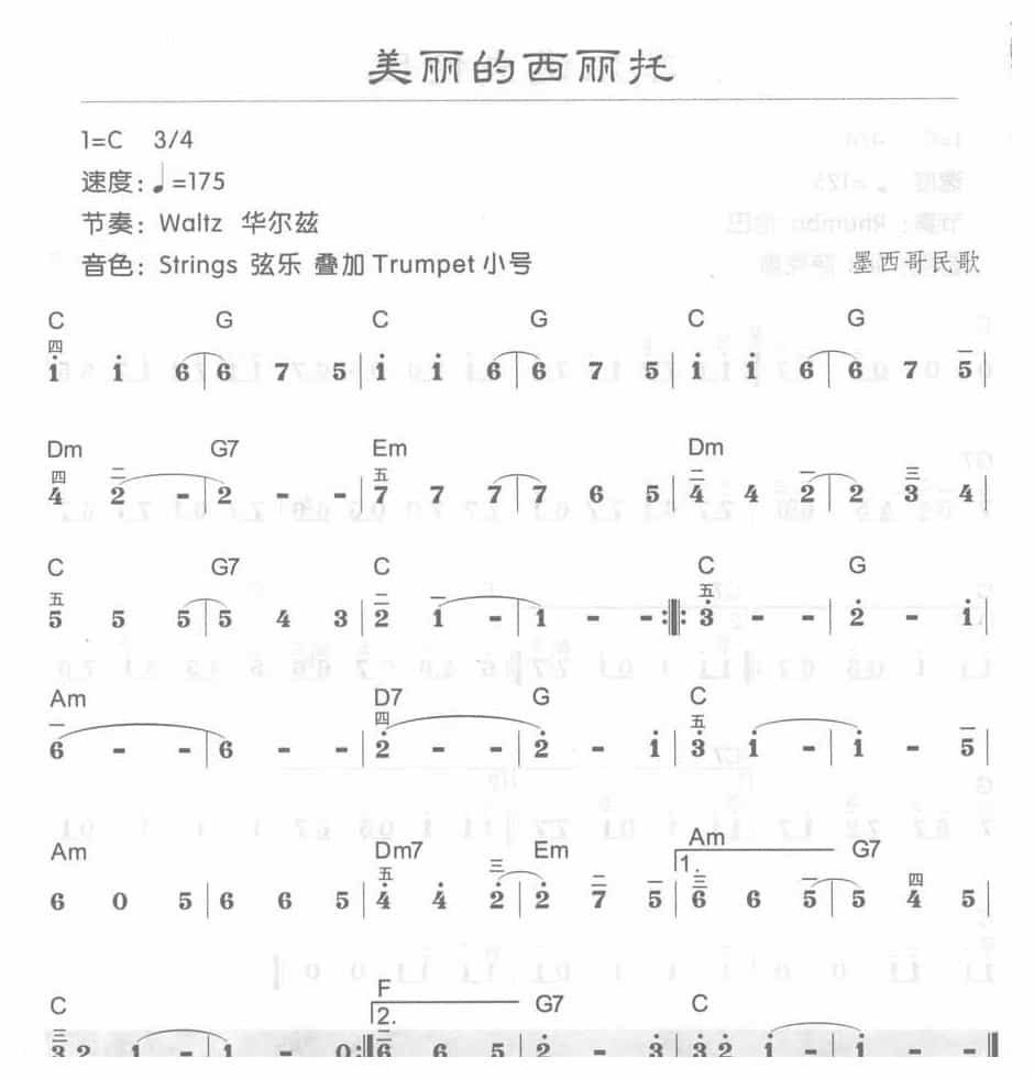 电子琴C大调a小调乐曲【美丽的西丽托】简谱带和弦简谱五线谱附歌词是乐器资源网于2017年03月22日 22:41:16整理更新,内容收录在电子琴乐谱栏目;乐器资源网免费分享专业、准确、规范、高清的电子琴乐谱简谱五线谱歌词等电子版资料,欢迎在线免费下载;乐器资源网无需注册会员,即可直接免费下载各类乐器学习相关资源。