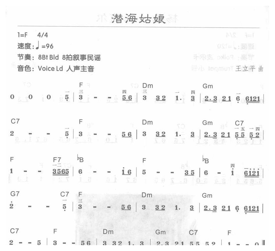 电子琴F大调d小调乐曲【潜海姑娘】简谱配和弦