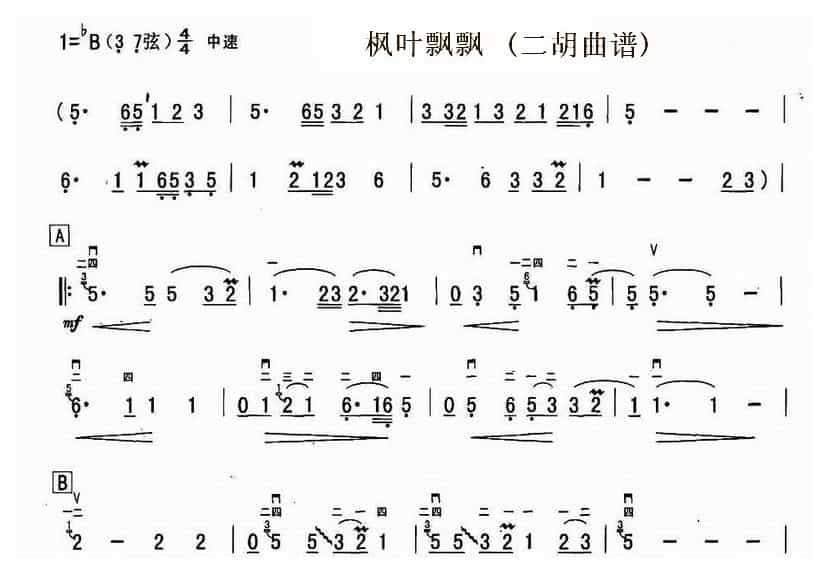 二胡谱【枫叶飘飘】简谱五线谱附歌词是乐器资源网于2015年10月26日 11:34:29整理更新,内容收录在二胡乐谱栏目;乐器资源网免费分享专业、准确、规范、高清的二胡乐谱简谱五线谱歌词等电子版资料,欢迎在线免费下载;乐器资源网无需注册会员,即可直接免费下载各类乐器学习相关资源。