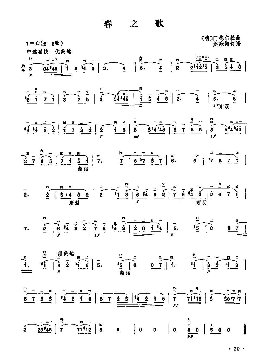 二胡演奏世界名曲100首028【春之歌】赵寒阳选编简谱五线谱附歌词是乐器资源网于2015年12月26日 16:23:19整理更新,内容收录在二胡乐谱栏目;乐器资源网免费分享专业、准确、规范、高清的二胡乐谱简谱五线谱歌词等电子版资料,欢迎在线免费下载;乐器资源网无需注册会员,即可直接免费下载各类乐器学习相关资源。