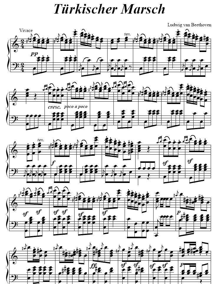 贝多芬-beethoven 土耳其进行曲 Turkish March 钢琴名人名曲谱简谱五线谱附歌词是乐器资源网于2014年10月23日 16:36:26整理更新,内容收录在钢琴乐谱栏目;乐器资源网免费分享专业、准确、规范、高清的钢琴乐谱简谱五线谱歌词等电子版资料,欢迎在线免费下载;乐器资源网无需注册会员,即可直接免费下载各类乐器学习相关资源。