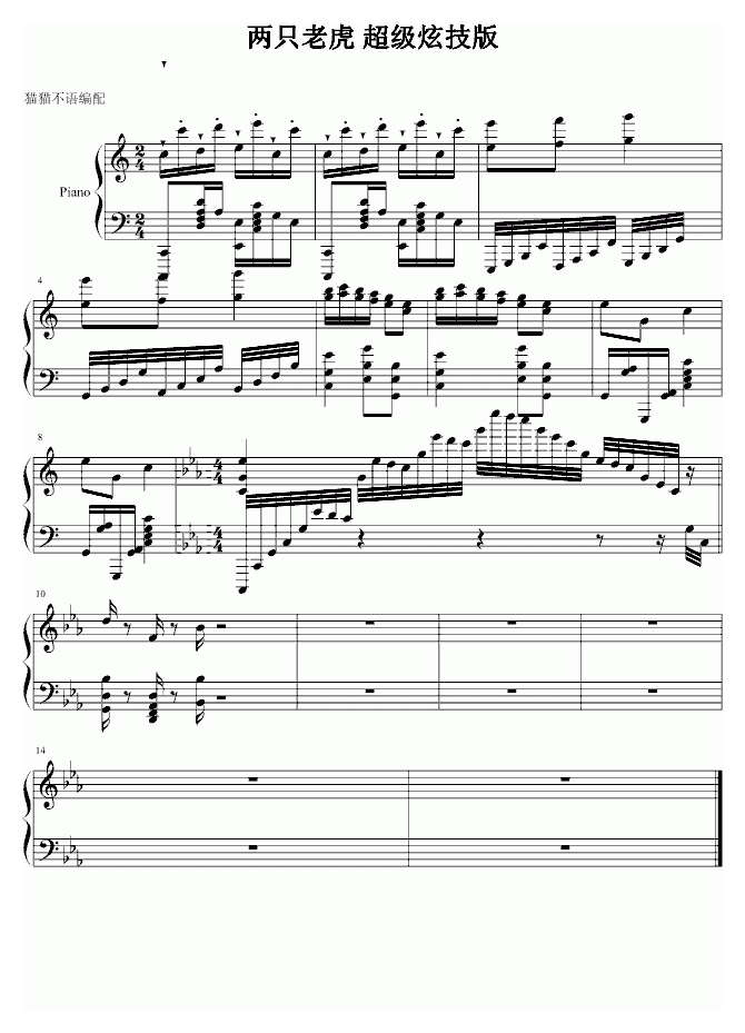 中国名曲 两只老虎 超级炫技版钢琴谱简谱五线谱附歌词是乐器资源网于2014年11月23日 10:51:44整理更新,内容收录在钢琴乐谱栏目;乐器资源网免费分享专业、准确、规范、高清的钢琴乐谱简谱五线谱歌词等电子版资料,欢迎在线免费下载;乐器资源网无需注册会员,即可直接免费下载各类乐器学习相关资源。