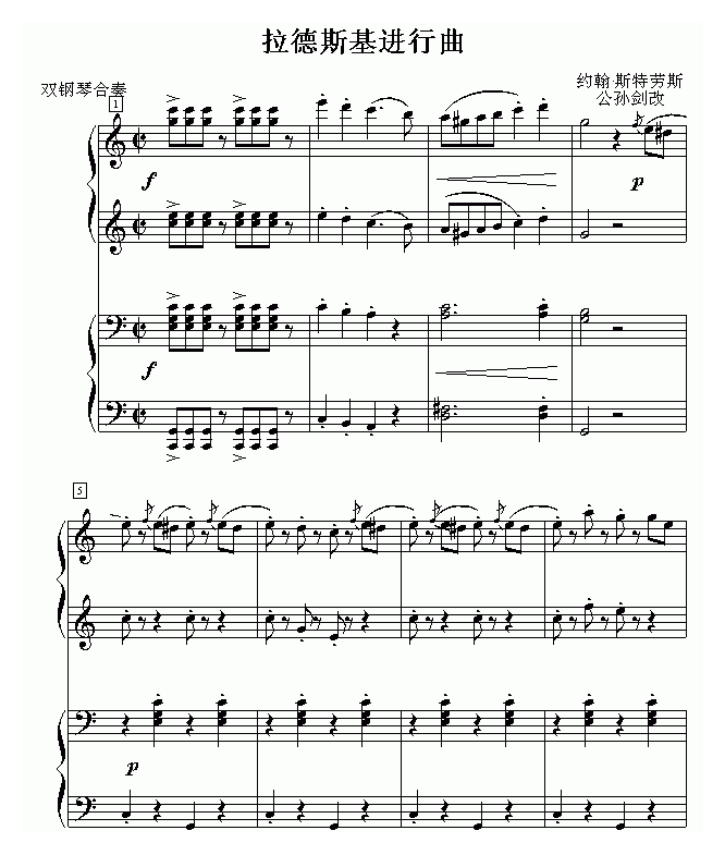 约翰·斯特劳斯 拉德斯基进行曲(钢琴名人名曲)简谱五线谱附歌词是乐器资源网于2014年10月26日 10:46:15整理更新,内容收录在钢琴乐谱栏目;乐器资源网免费分享专业、准确、规范、高清的钢琴乐谱简谱五线谱歌词等电子版资料,欢迎在线免费下载;乐器资源网无需注册会员,即可直接免费下载各类乐器学习相关资源。