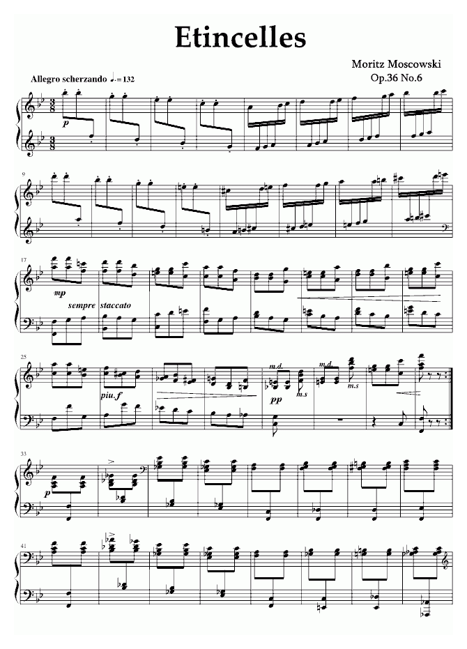 莫什科夫斯基 Moszkowski 火花(Op.36 No.6) 钢琴谱简谱五线谱附歌词是乐器资源网于2014年11月26日 15:29:07整理更新,内容收录在钢琴乐谱栏目;乐器资源网免费分享专业、准确、规范、高清的钢琴乐谱简谱五线谱歌词等电子版资料,欢迎在线免费下载;乐器资源网无需注册会员,即可直接免费下载各类乐器学习相关资源。