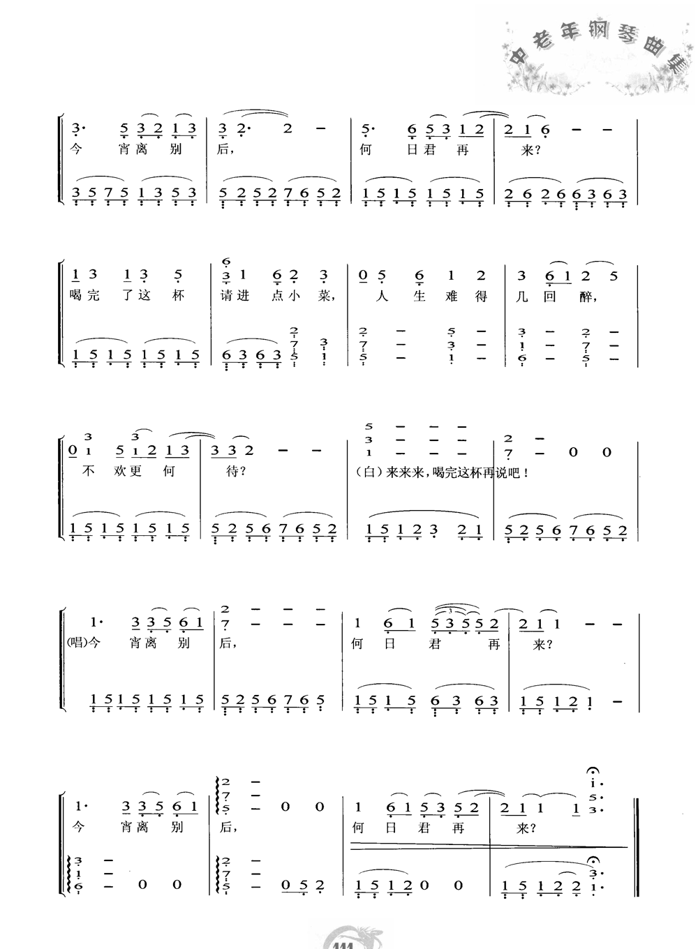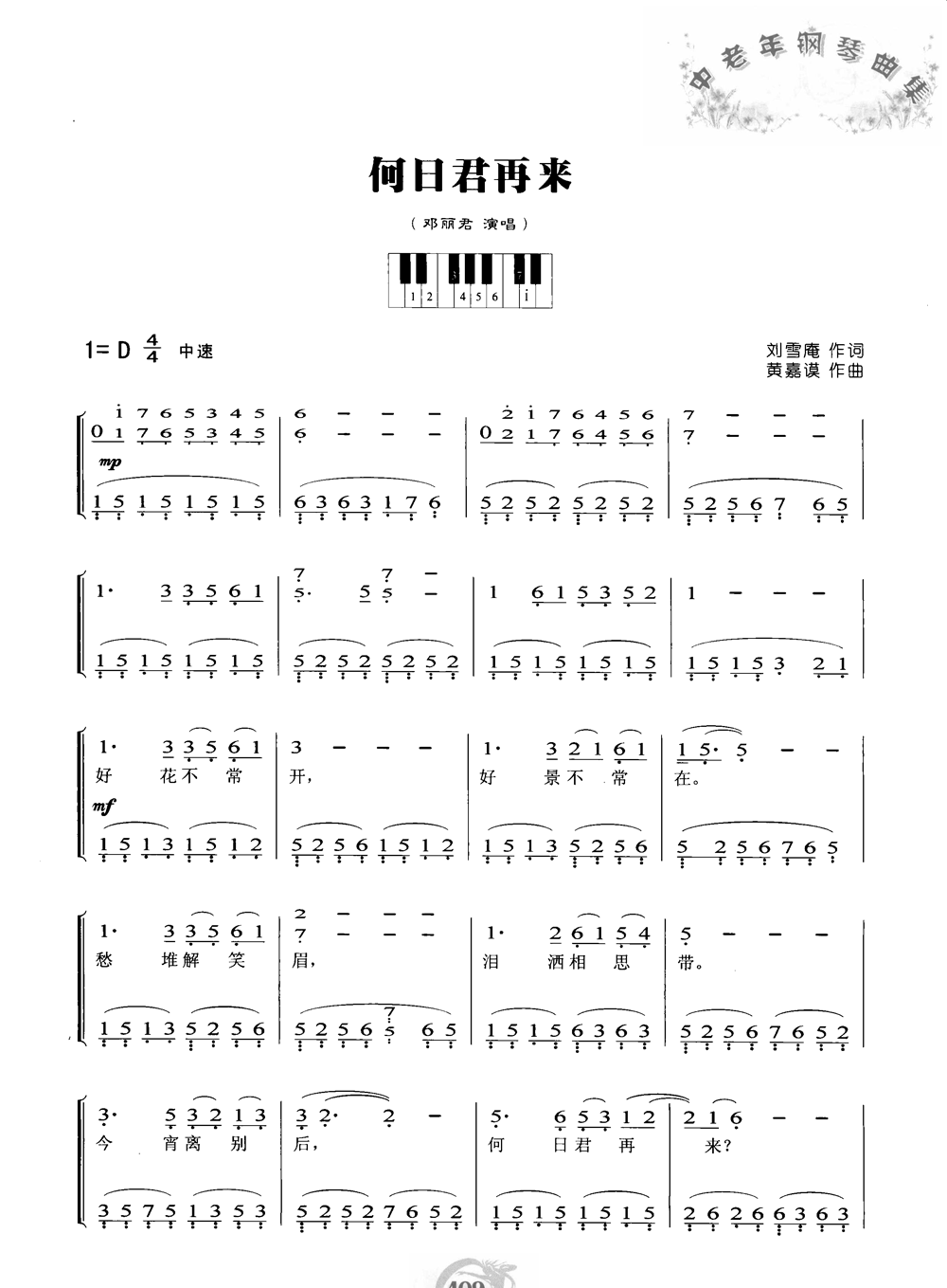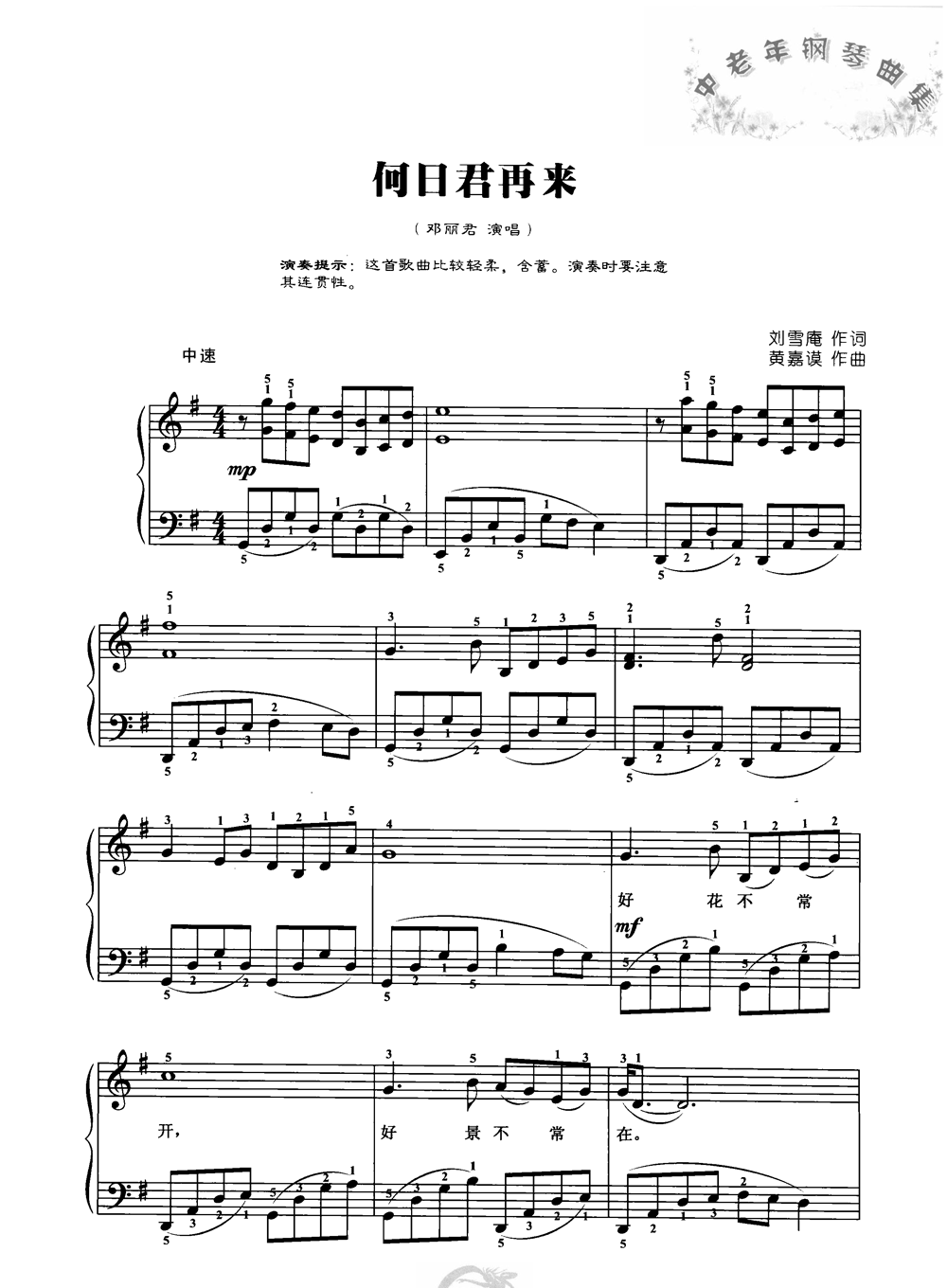 中老年钢琴曲集【何日君再来】简谱与五线谱 赵志军简谱五线谱附歌词是乐器资源网于2017年02月27日 04:02:28整理更新,内容收录在钢琴乐谱栏目;乐器资源网免费分享专业、准确、规范、高清的钢琴乐谱简谱五线谱歌词等电子版资料,欢迎在线免费下载;乐器资源网无需注册会员,即可直接免费下载各类乐器学习相关资源。