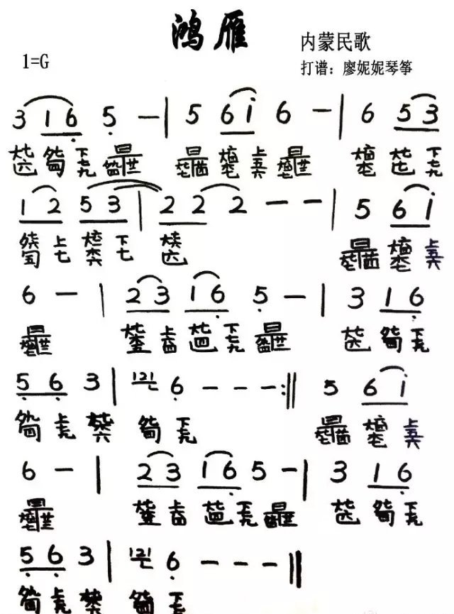 现代古琴谱【鸿雁】廖妮妮简谱五线谱附歌词是乐器资源网于2017年03月04日 02:47:09整理更新,内容收录在古琴乐谱栏目;乐器资源网免费分享专业、准确、规范、高清的古琴乐谱简谱五线谱歌词等电子版资料,欢迎在线免费下载;乐器资源网无需注册会员,即可直接免费下载各类乐器学习相关资源。