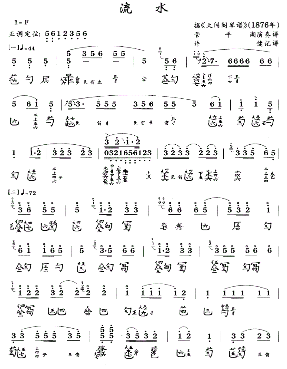 流水,汉族古琴曲。最早见于朱权的《神奇秘谱》。但是现时弹《流水》的都是用的张孔山的《流水》。张孔山的《流水》,仅见于一个刻本的《天闻阁琴谱》(1867),但是四川华阳顾玉成(1808一1876)所传的张孔山《流水》传钞本却不很同。1850左右张孔山传于武汉的谱本又不同。
