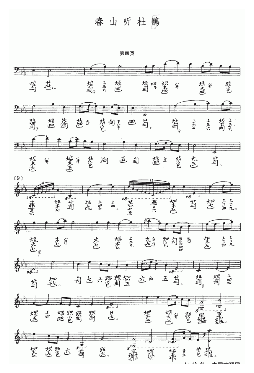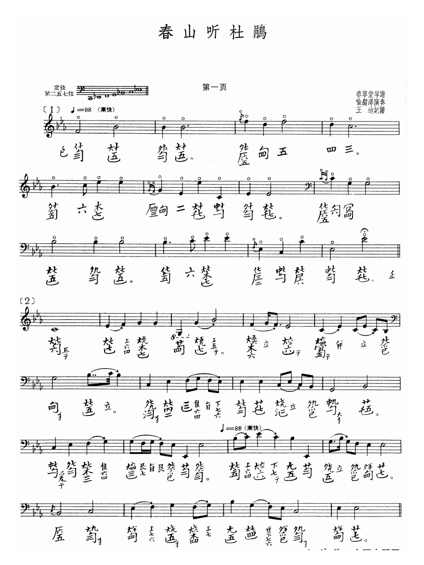 古琴曲《春山听杜鹃》乐谱简谱五线谱附歌词是乐器资源网于2014年02月21日 14:39:19整理更新,内容收录在古琴乐谱栏目;乐器资源网免费分享专业、准确、规范、高清的古琴乐谱简谱五线谱歌词等电子版资料,欢迎在线免费下载;乐器资源网无需注册会员,即可直接免费下载各类乐器学习相关资源。
