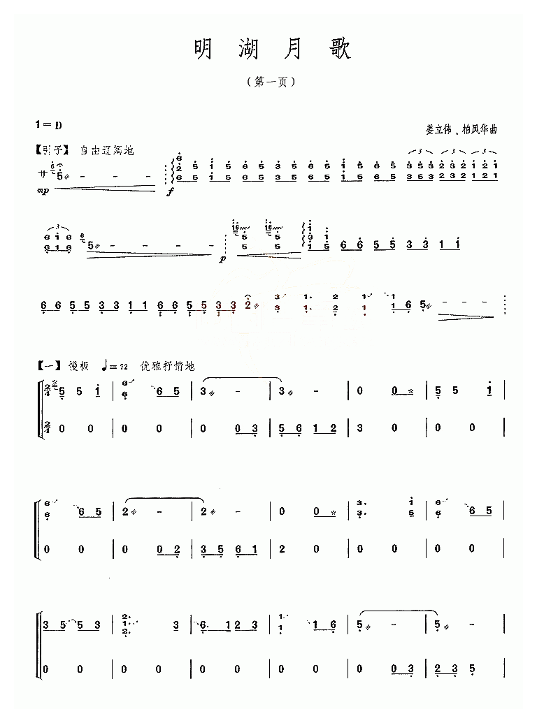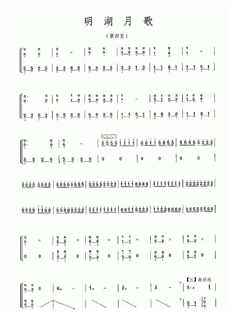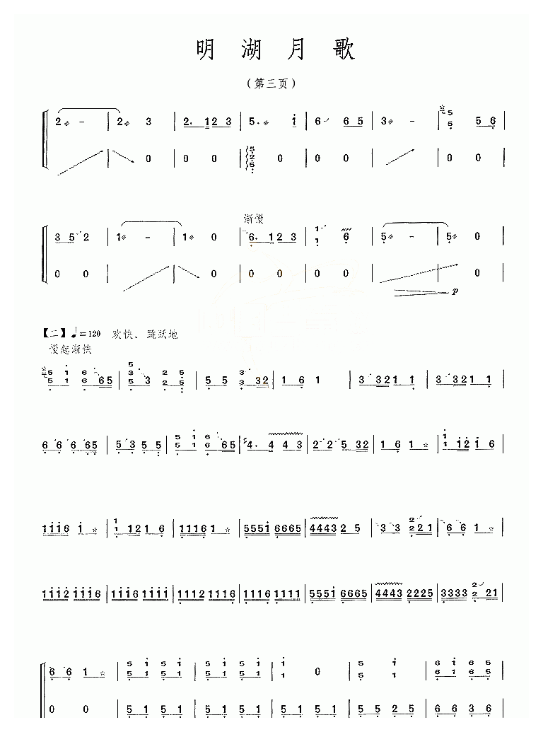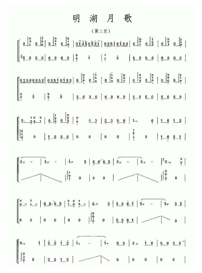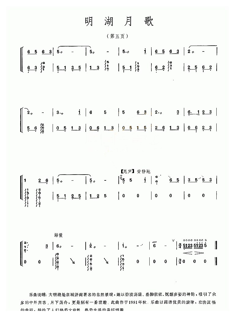 古筝谱【明湖月歌】简谱五线谱附歌词是乐器资源网于2016年06月03日 18:09:57整理更新,内容收录在古筝乐谱栏目;乐器资源网免费分享专业、准确、规范、高清的古筝乐谱简谱五线谱歌词等电子版资料,欢迎在线免费下载;乐器资源网无需注册会员,即可直接免费下载各类乐器学习相关资源。