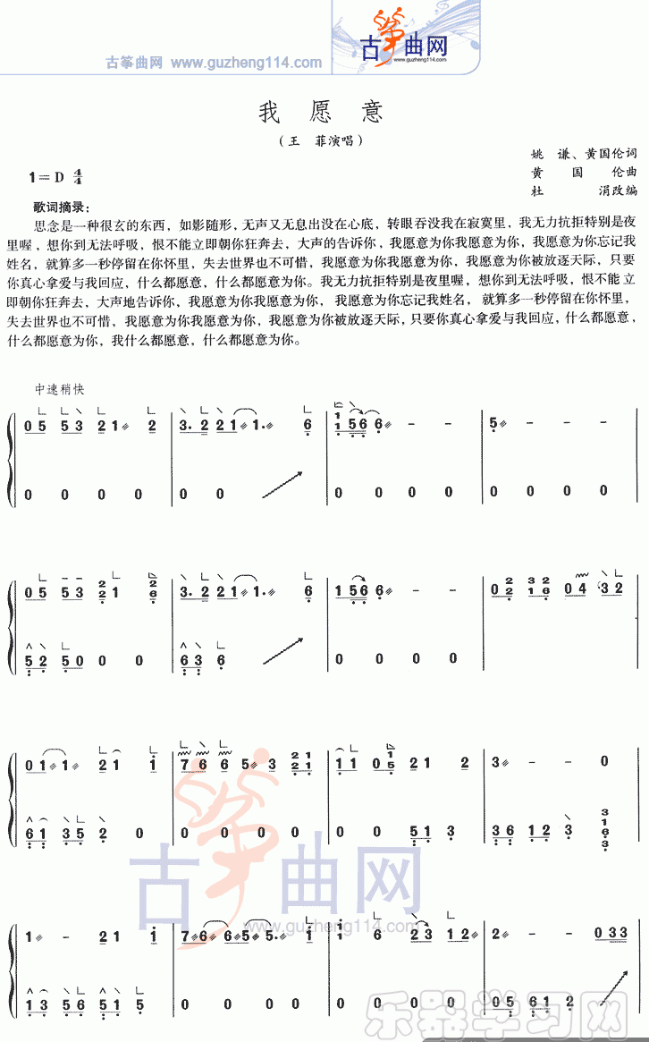 我愿意简谱五线谱附歌词是乐器资源网于2012年11月09日 10:41:39整理更新,内容收录在古筝乐谱栏目;乐器资源网免费分享专业、准确、规范、高清的古筝乐谱简谱五线谱歌词等电子版资料,欢迎在线免费下载;乐器资源网无需注册会员,即可直接免费下载各类乐器学习相关资源。