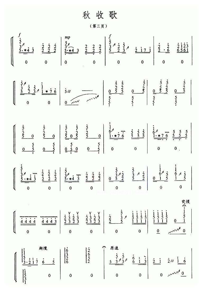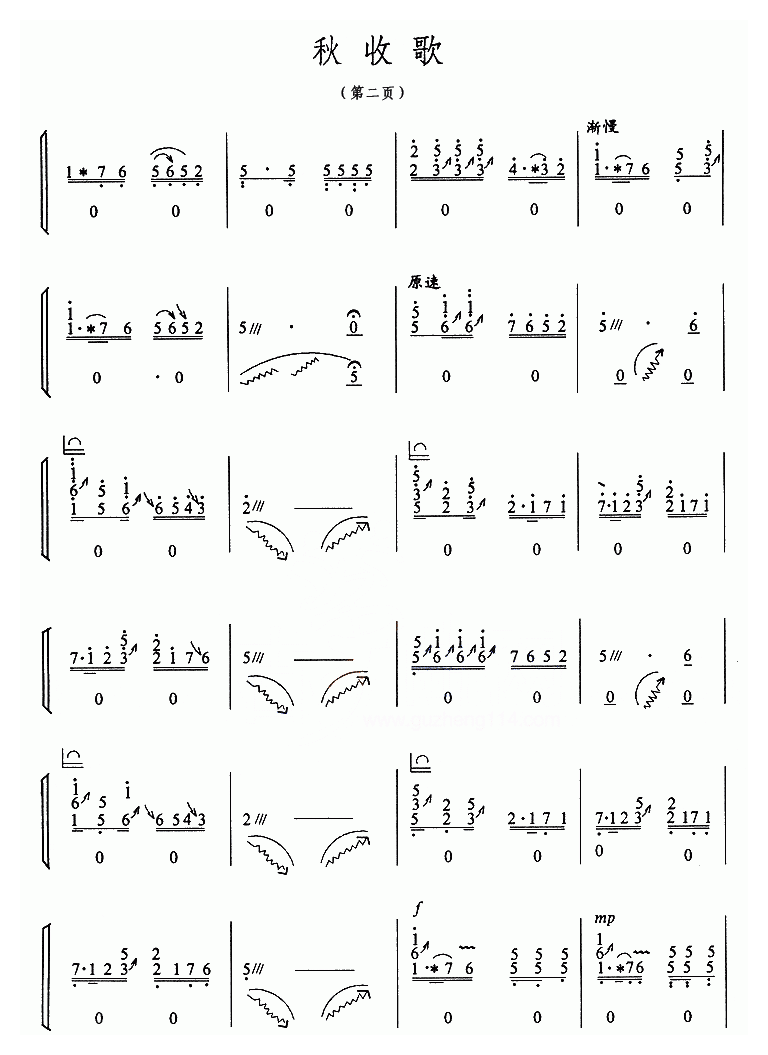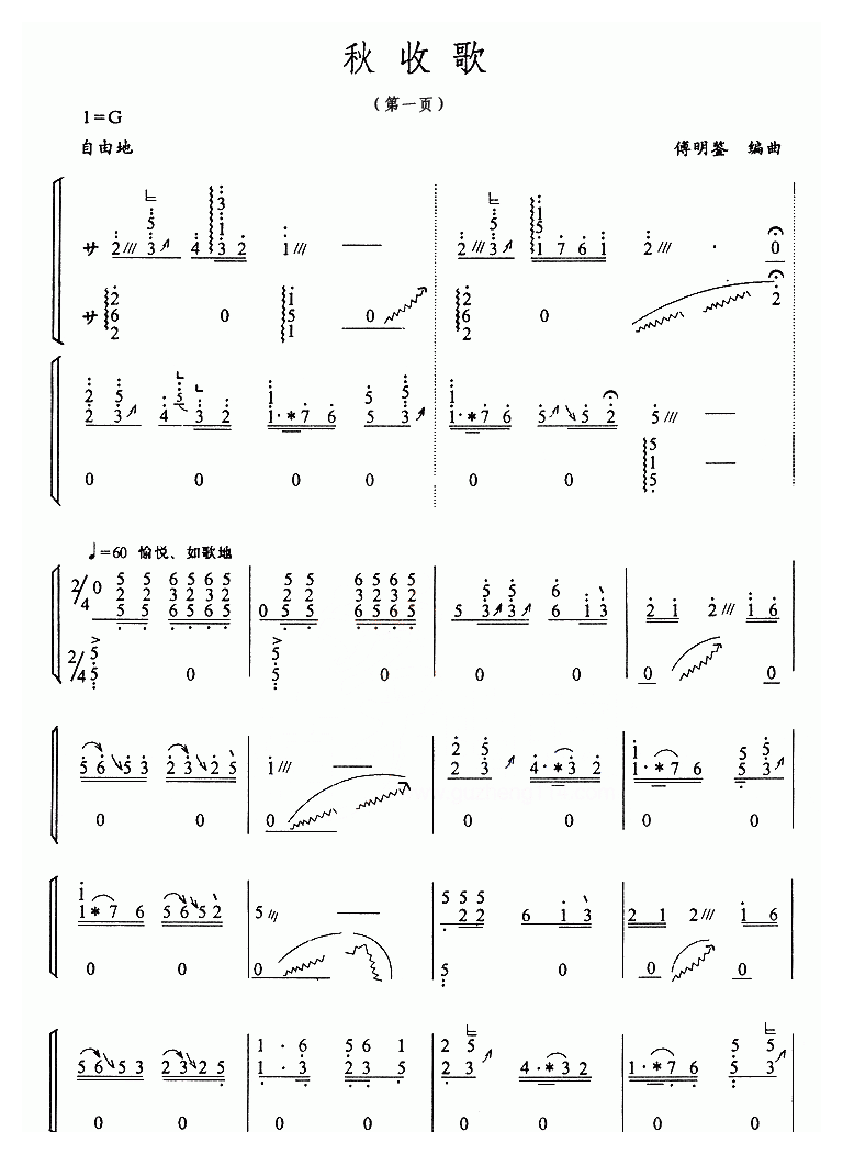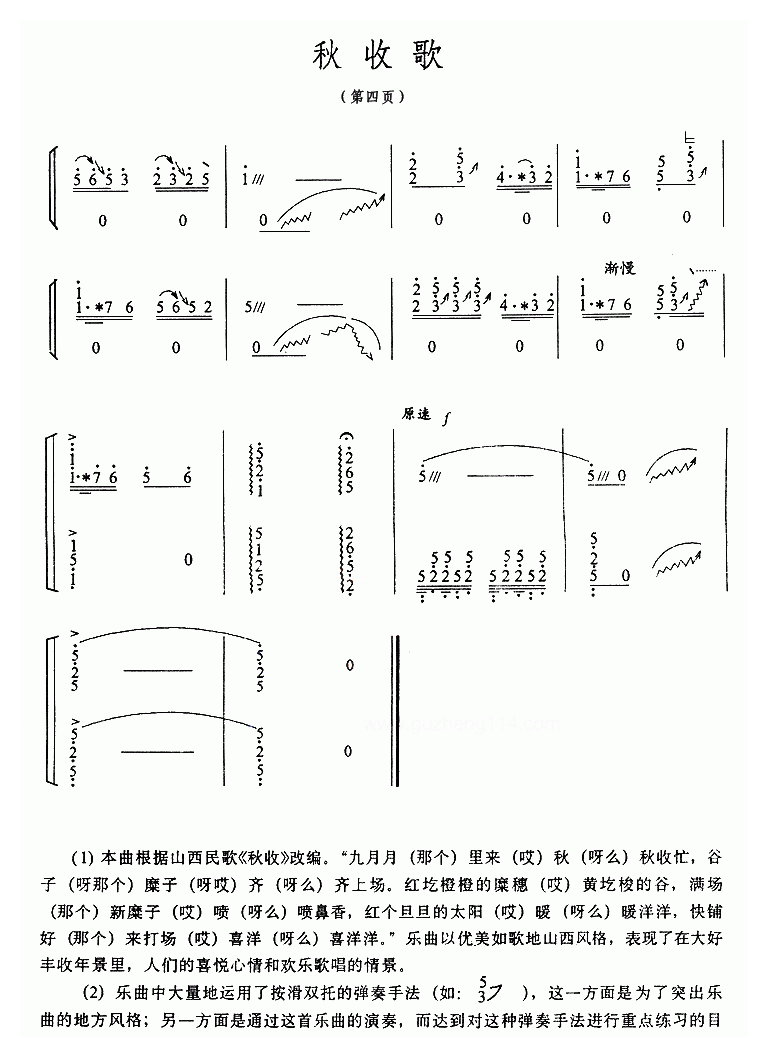 古筝曲【秋收歌】简谱五线谱附歌词是乐器资源网于2016年05月14日 16:38:03整理更新,内容收录在古筝乐谱栏目;乐器资源网免费分享专业、准确、规范、高清的古筝乐谱简谱五线谱歌词等电子版资料,欢迎在线免费下载;乐器资源网无需注册会员,即可直接免费下载各类乐器学习相关资源。