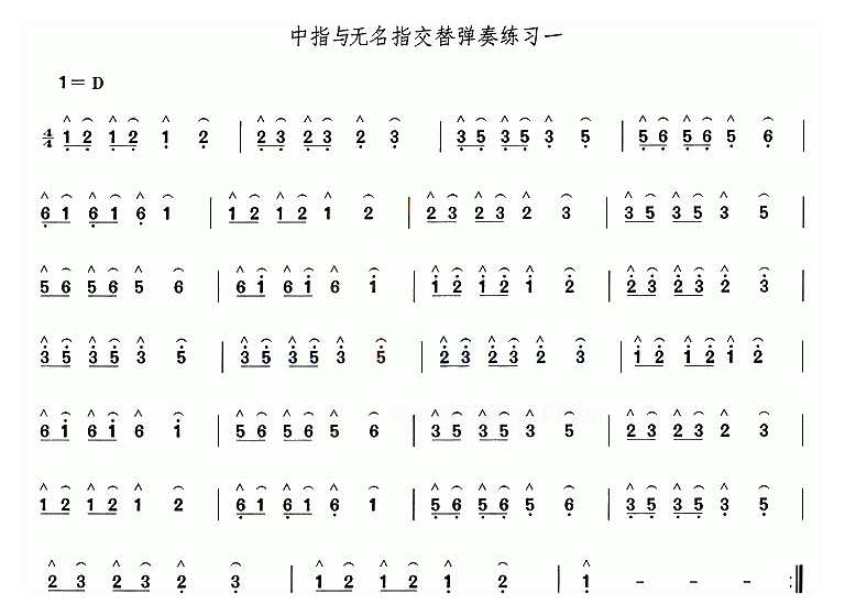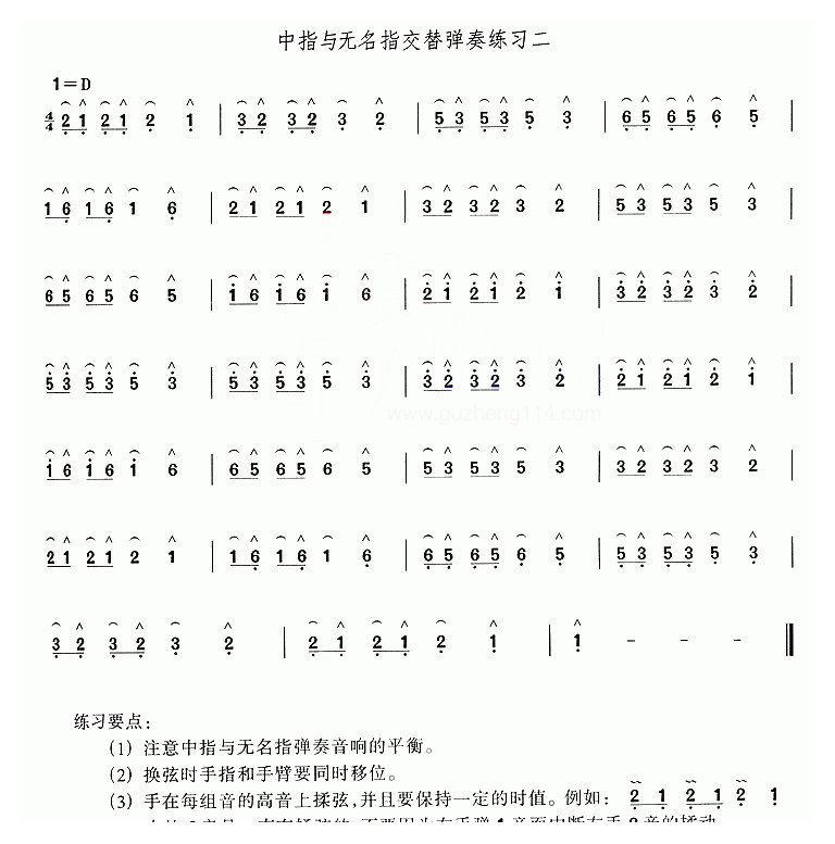 古筝练习曲谱【中指与无名指交替练习】古筝入门指法练习谱简谱五线谱附歌词是乐器资源网于2016年06月15日 11:17:42整理更新,内容收录在古筝乐谱栏目;乐器资源网免费分享专业、准确、规范、高清的古筝乐谱简谱五线谱歌词等电子版资料,欢迎在线免费下载;乐器资源网无需注册会员,即可直接免费下载各类乐器学习相关资源。