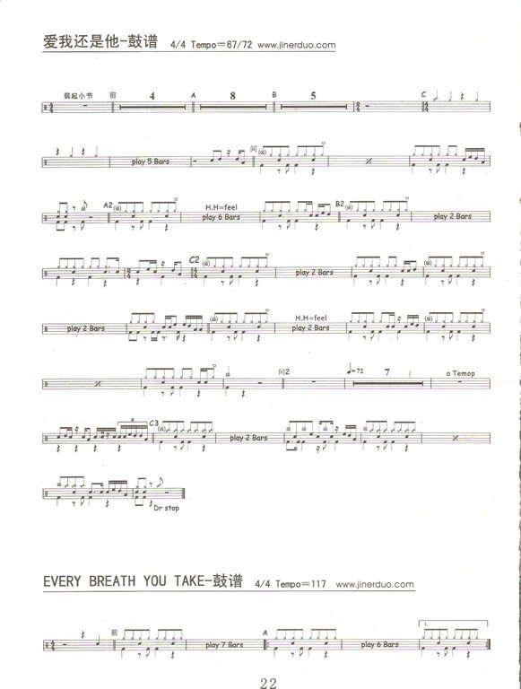 鼓谱架子鼓谱:爱我还是他简谱五线谱附歌词是乐器资源网于2014年06月21日 23:04:44整理更新,内容收录在爵士鼓乐谱栏目;乐器资源网免费分享专业、准确、规范、高清的爵士鼓乐谱简谱五线谱歌词等电子版资料,欢迎在线免费下载;乐器资源网无需注册会员,即可直接免费下载各类乐器学习相关资源。