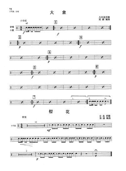 小军鼓鼓谱之“大象、樱花”简谱五线谱附歌词是乐器资源网于2014年06月24日 14:33:20整理更新,内容收录在爵士鼓乐谱栏目;乐器资源网免费分享专业、准确、规范、高清的爵士鼓乐谱简谱五线谱歌词等电子版资料,欢迎在线免费下载;乐器资源网无需注册会员,即可直接免费下载各类乐器学习相关资源。