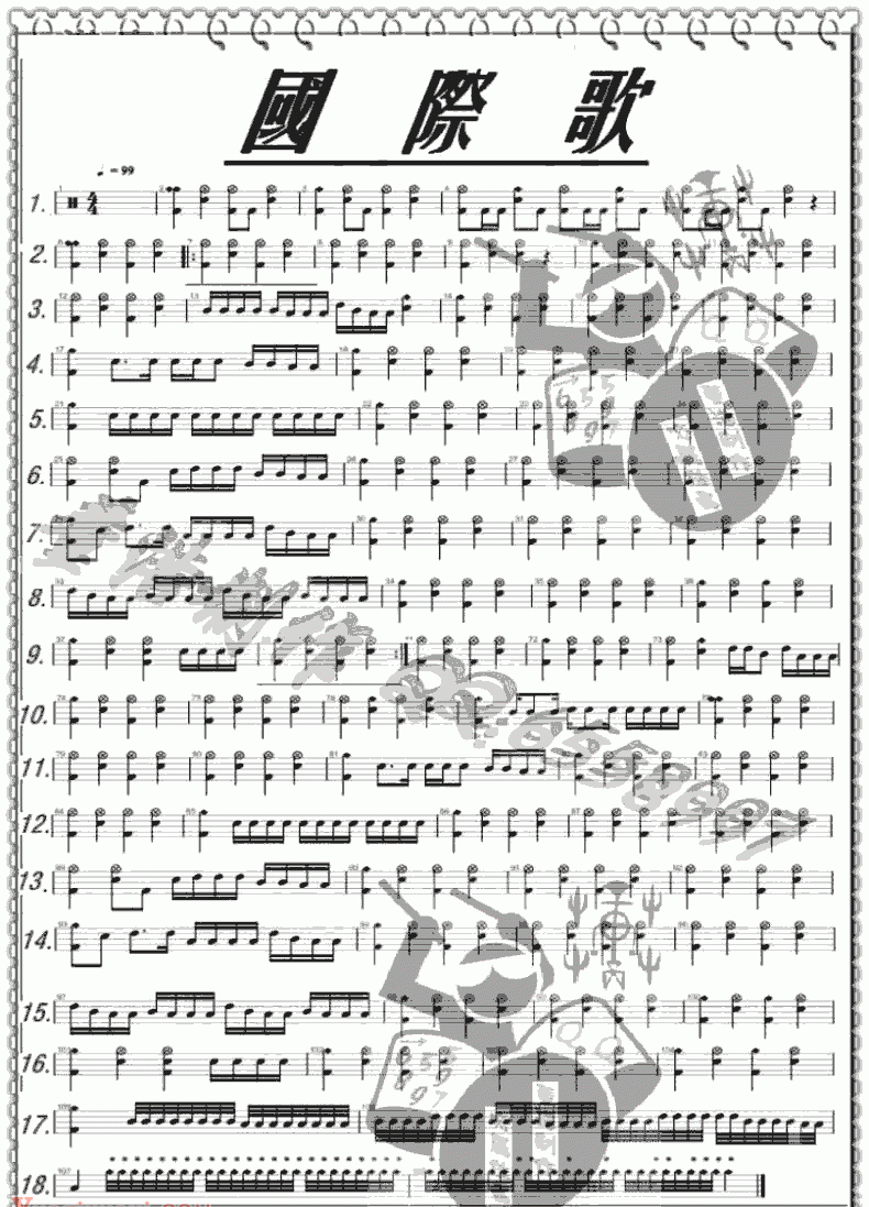 国际歌鼓谱简谱五线谱附歌词是乐器资源网于2014年06月26日 13:51:08整理更新,内容收录在爵士鼓乐谱栏目;乐器资源网免费分享专业、准确、规范、高清的爵士鼓乐谱简谱五线谱歌词等电子版资料,欢迎在线免费下载;乐器资源网无需注册会员,即可直接免费下载各类乐器学习相关资源。