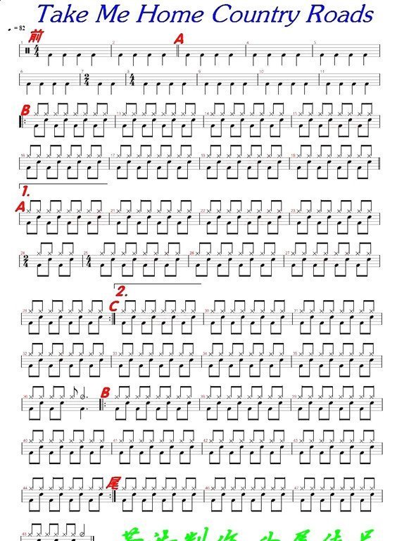 架子鼓谱:John Denver - Take Me Home Country简谱五线谱附歌词是乐器资源网于2014年06月26日 13:58:35整理更新,内容收录在爵士鼓乐谱栏目;乐器资源网免费分享专业、准确、规范、高清的爵士鼓乐谱简谱五线谱歌词等电子版资料,欢迎在线免费下载;乐器资源网无需注册会员,即可直接免费下载各类乐器学习相关资源。