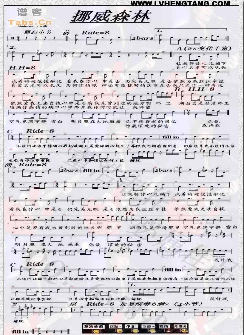 架子鼓谱:挪威森林简谱五线谱附歌词是乐器资源网于2014年06月26日 14:07:41整理更新,内容收录在爵士鼓乐谱栏目;乐器资源网免费分享专业、准确、规范、高清的爵士鼓乐谱简谱五线谱歌词等电子版资料,欢迎在线免费下载;乐器资源网无需注册会员,即可直接免费下载各类乐器学习相关资源。