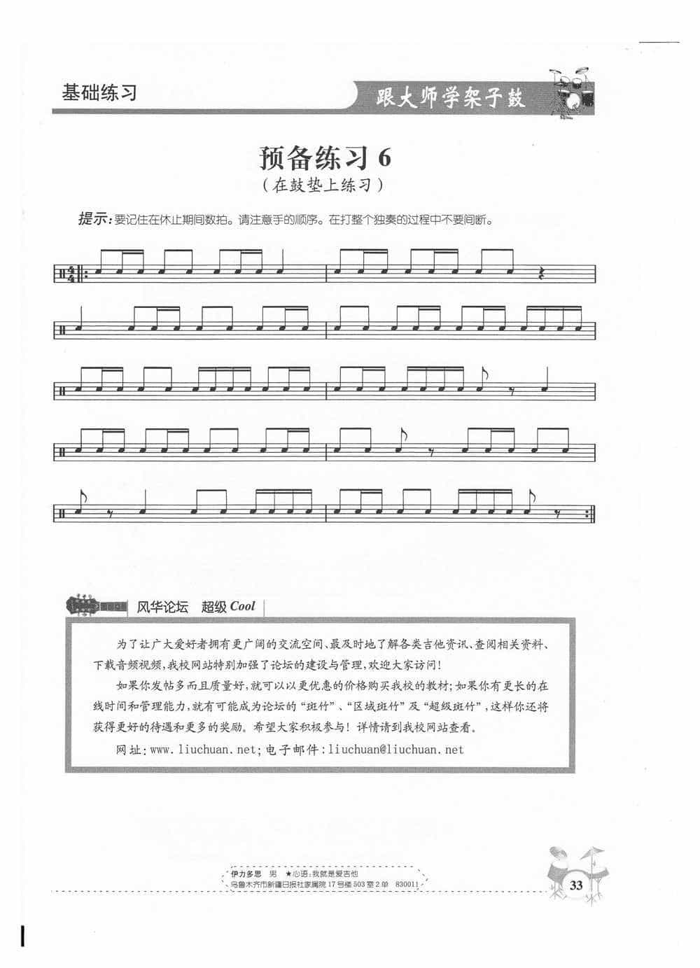 练得熟练之后大家可将它们重音移位,手脚互换等等,作展开练习,反正大家都知道,打击乐这种东西深究下去是没个尽头的,一番排列组合就足以把你弄得晕乎乎的。下面就给大家一一道来。 ...