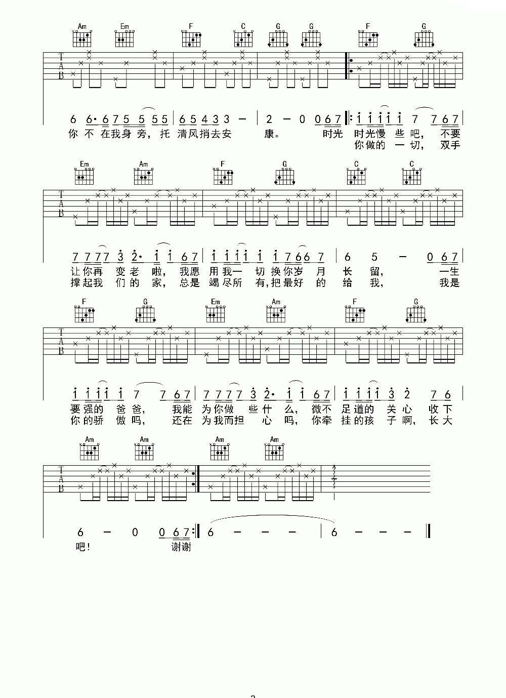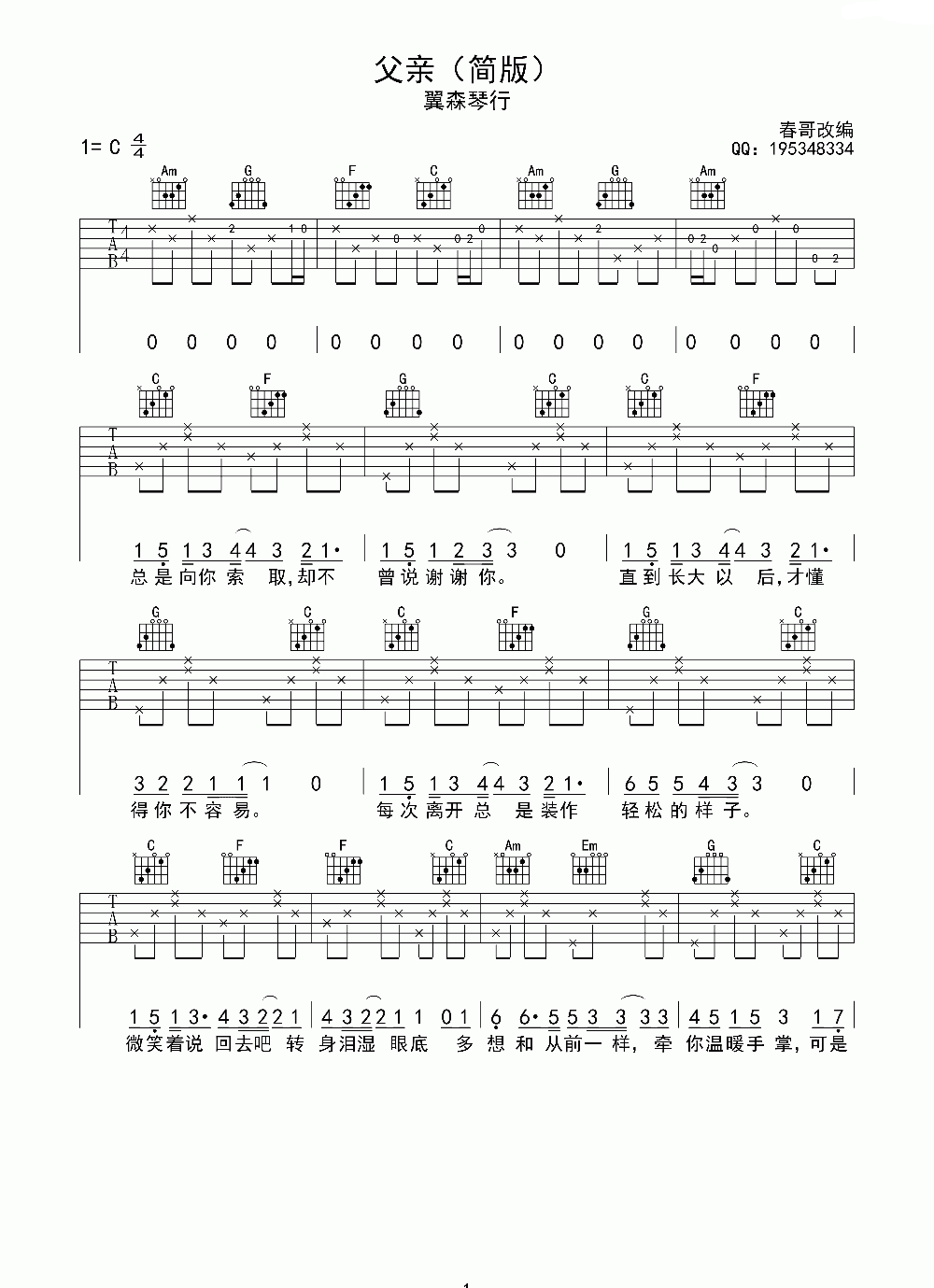 【吉他谱简单版】筷子兄弟《父亲》吉他谱 C调简单版简谱五线谱附歌词是乐器资源网于2015年05月06日 10:02:54整理更新,内容收录在吉他乐谱栏目;乐器资源网免费分享专业、准确、规范、高清的吉他乐谱简谱五线谱歌词等电子版资料,欢迎在线免费下载;乐器资源网无需注册会员,即可直接免费下载各类乐器学习相关资源。