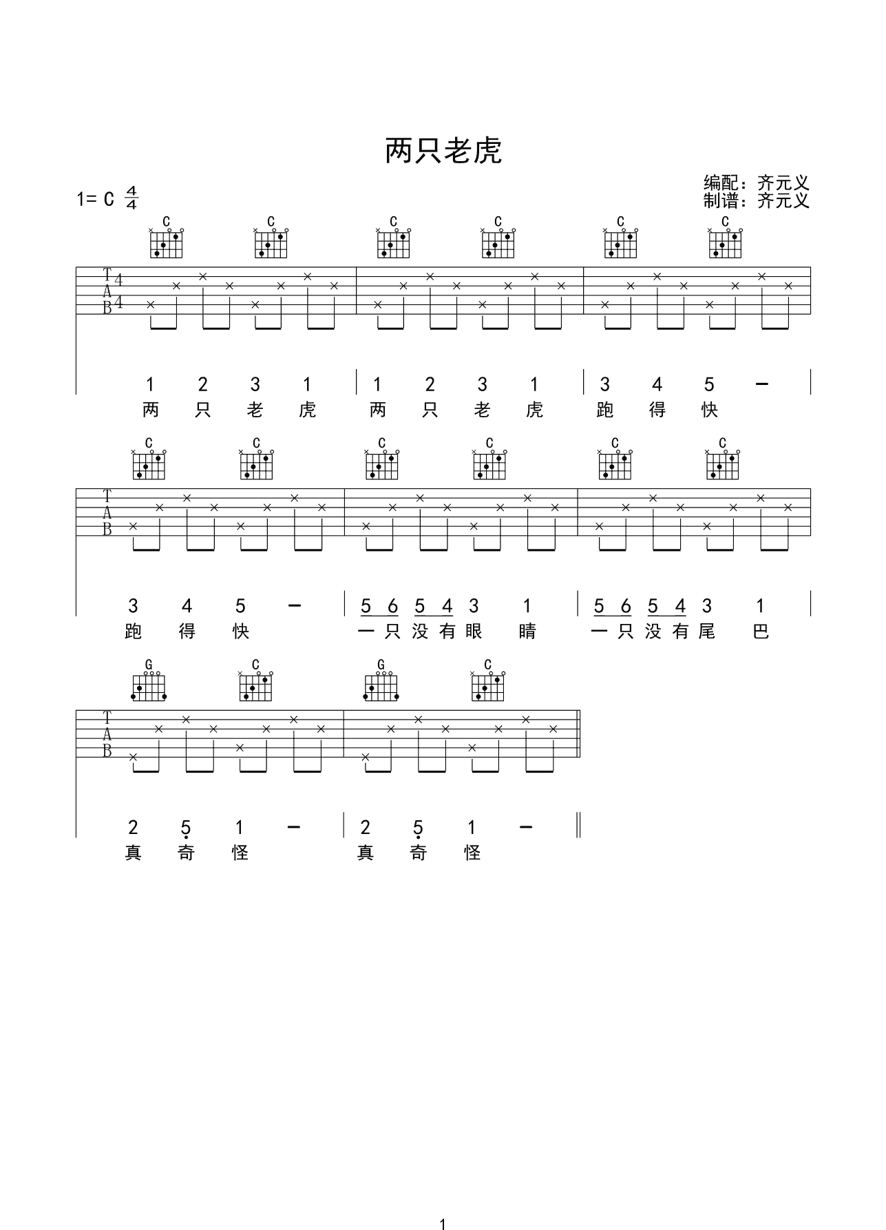 【吉他谱简单版】儿歌两只老虎吉他谱 C调简单版简谱五线谱附歌词是乐器资源网于2015年05月06日 11:30:25整理更新,内容收录在吉他乐谱栏目;乐器资源网免费分享专业、准确、规范、高清的吉他乐谱简谱五线谱歌词等电子版资料,欢迎在线免费下载;乐器资源网无需注册会员,即可直接免费下载各类乐器学习相关资源。