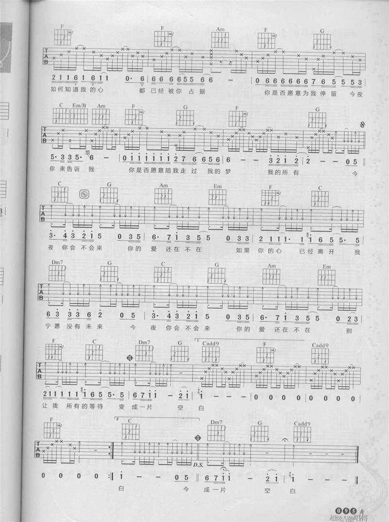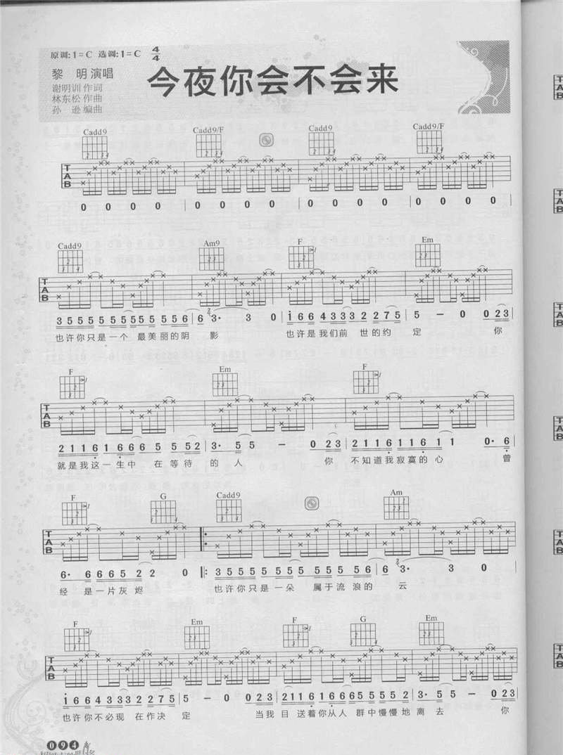 黎明吉他曲谱 今夜你会不会来简谱五线谱附歌词是乐器资源网于2014年05月10日 11:31:15整理更新,内容收录在吉他乐谱栏目;乐器资源网免费分享专业、准确、规范、高清的吉他乐谱简谱五线谱歌词等电子版资料,欢迎在线免费下载;乐器资源网无需注册会员,即可直接免费下载各类乐器学习相关资源。