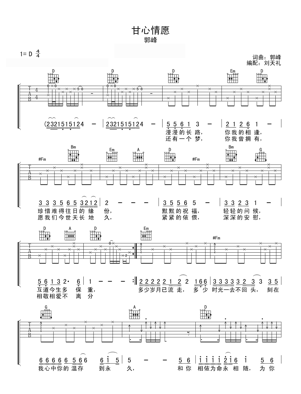 甘心情愿吉他谱 郭峰甘心情愿六线谱高清版简谱五线谱附歌词是乐器资源网于2016年08月14日 17:45:29整理更新,内容收录在吉他乐谱栏目;乐器资源网免费分享专业、准确、规范、高清的吉他乐谱简谱五线谱歌词等电子版资料,欢迎在线免费下载;乐器资源网无需注册会员,即可直接免费下载各类乐器学习相关资源。