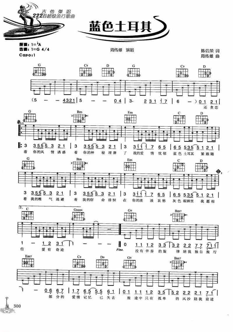 吉他弹唱222首超级流行歌曲谱:蓝色土耳其(周传雄)简谱五线谱附歌词是乐器资源网于2014年03月17日 22:42:08整理更新,内容收录在吉他乐谱栏目;乐器资源网免费分享专业、准确、规范、高清的吉他乐谱简谱五线谱歌词等电子版资料,欢迎在线免费下载;乐器资源网无需注册会员,即可直接免费下载各类乐器学习相关资源。