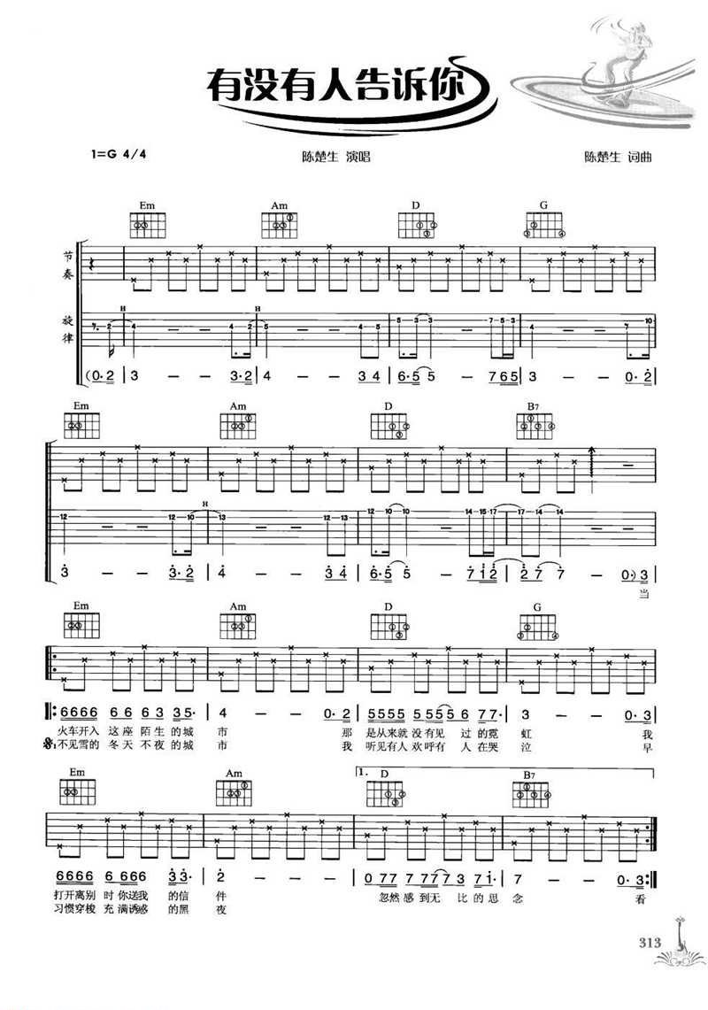 吉他弹唱222首超级流行歌曲谱:有没有人告诉你(陈楚生)简谱五线谱附歌词是乐器资源网于2014年03月17日 22:50:39整理更新,内容收录在吉他乐谱栏目;乐器资源网免费分享专业、准确、规范、高清的吉他乐谱简谱五线谱歌词等电子版资料,欢迎在线免费下载;乐器资源网无需注册会员,即可直接免费下载各类乐器学习相关资源。