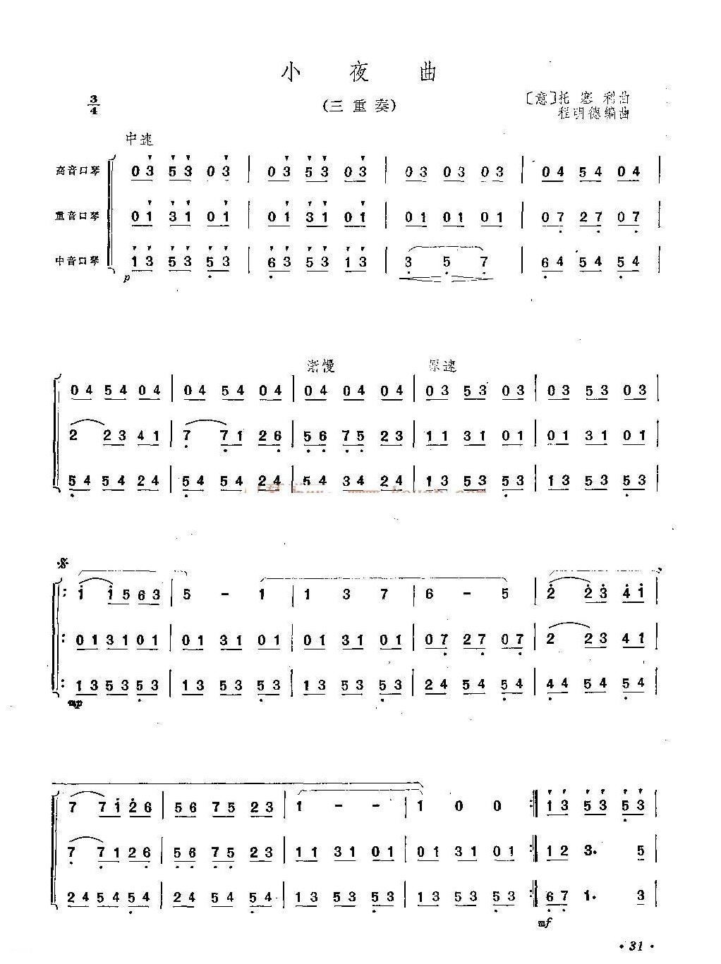 口琴三重奏谱【小夜曲】世界名曲 程明德编配简谱五线谱附歌词是乐器资源网于2015年05月01日 21:45:57整理更新,内容收录在口琴乐谱栏目;乐器资源网免费分享专业、准确、规范、高清的口琴乐谱简谱五线谱歌词等电子版资料,欢迎在线免费下载;乐器资源网无需注册会员,即可直接免费下载各类乐器学习相关资源。