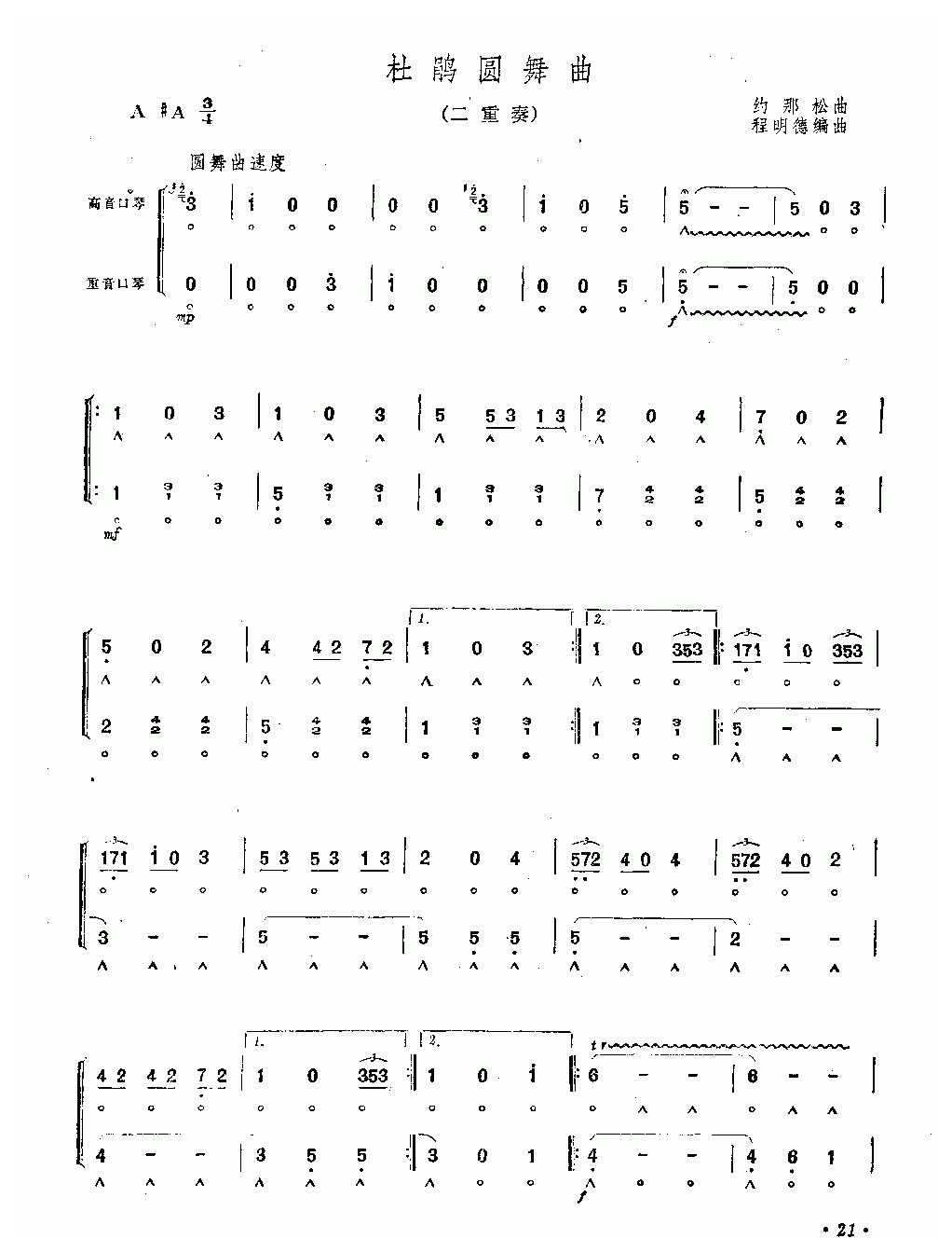 口琴二重奏谱【杜鹃圆舞曲】简谱 难易程度中下简谱五线谱附歌词是乐器资源网于2015年05月01日 22:20:28整理更新,内容收录在口琴乐谱栏目;乐器资源网免费分享专业、准确、规范、高清的口琴乐谱简谱五线谱歌词等电子版资料,欢迎在线免费下载;乐器资源网无需注册会员,即可直接免费下载各类乐器学习相关资源。