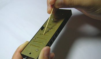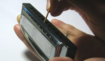 如果此时问题依旧,也就说那个音符仍然被堵,那么簧片通常是捕捉到了什么固体性的东西,例如一小段头发或口腔异物。拿一个木质的牙签,放在不发声的吹孔里,轻推对应的簧片。注意,吹气簧片应该是那些对着吹孔能看到的簧片。
