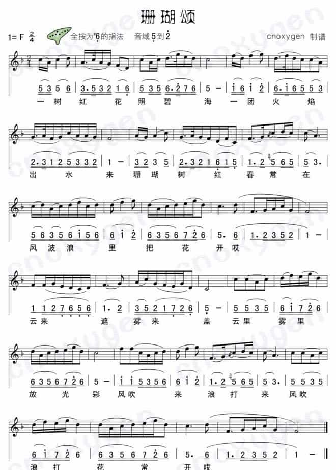 高清6孔陶笛彩谱:珊瑚颂 五线谱简谱五线谱附歌词是乐器资源网于2013年11月24日 18:46:05整理更新,内容收录在陶笛乐谱栏目;乐器资源网免费分享专业、准确、规范、高清的陶笛乐谱简谱五线谱歌词等电子版资料,欢迎在线免费下载;乐器资源网无需注册会员,即可直接免费下载各类乐器学习相关资源。
