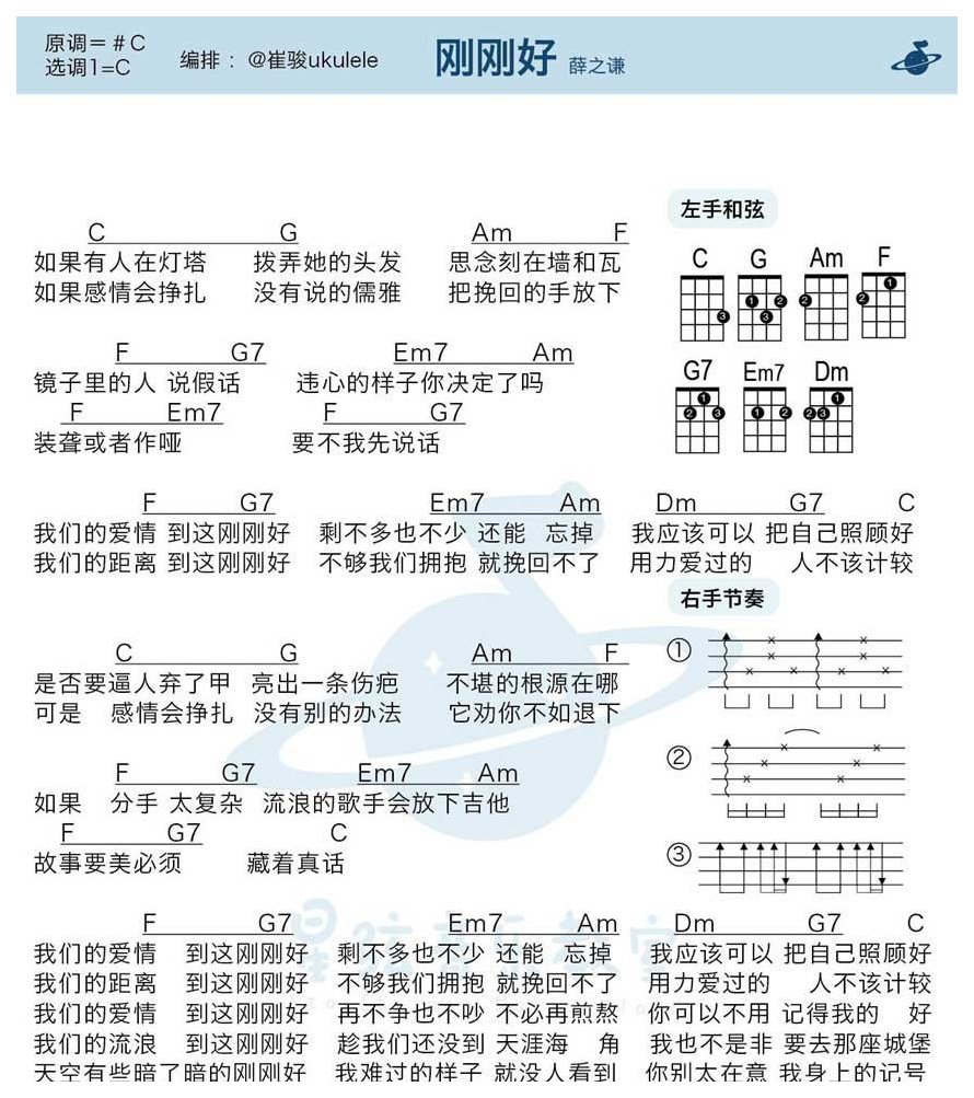 UKULELE谱【刚刚好】薛之谦简谱五线谱附歌词是乐器资源网于2016年11月11日 16:15:18整理更新,内容收录在尤克里里乐谱栏目;乐器资源网免费分享专业、准确、规范、高清的尤克里里乐谱简谱五线谱歌词等电子版资料,欢迎在线免费下载;乐器资源网无需注册会员,即可直接免费下载各类乐器学习相关资源。