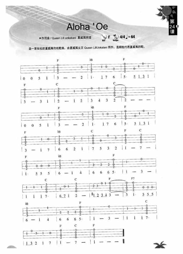 《Aloha'Oe》是一首著名的夏威夷传统民谣,接着明亮轻快,是颇能代表夏威夷的歌曲,为很多人所喜欢。本文为《Aloha'Oe》ukulele曲谱,欢迎学习演奏。