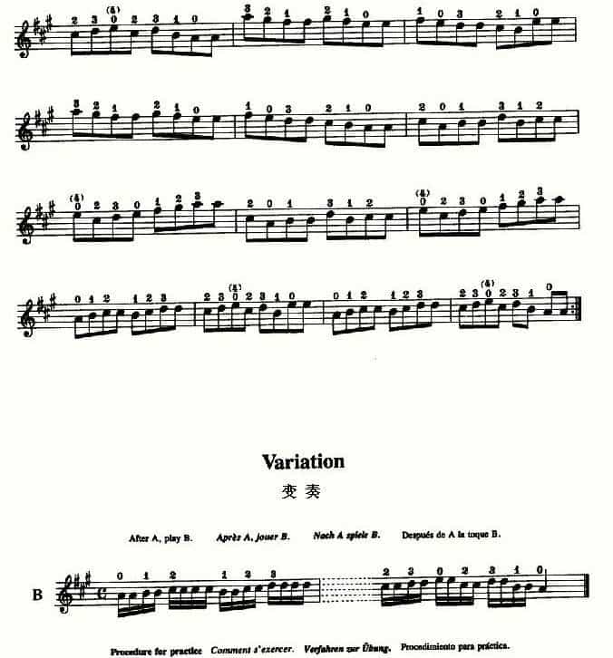 练习时,就像第三课《闪烁的小星星》一样,先拉主题,再练变奏。变奏乐谱采取省略的形式记谱,你应找出它的规律从头到尾拉出来。实际上变奏一(变奏第一行谱)是把主题的每个八分音符拉成两个十六分音符,聪明的你想必知道。变奏二(变奏第二行谱)也是如此,不过每两个十六分音符后加了个八分休止符。