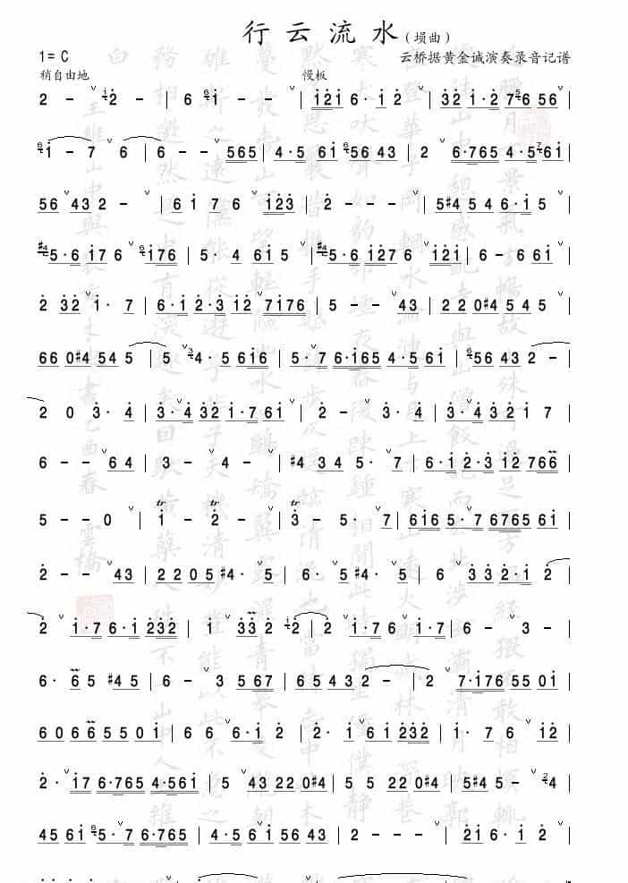 埙曲谱:《行云流水》曲谱(据黄金诚演奏录音记谱)简谱五线谱附歌词是乐器资源网于2013年05月11日 21:36:33整理更新,内容收录在陶埙乐谱栏目;乐器资源网免费分享专业、准确、规范、高清的陶埙乐谱简谱五线谱歌词等电子版资料,欢迎在线免费下载;乐器资源网无需注册会员,即可直接免费下载各类乐器学习相关资源。