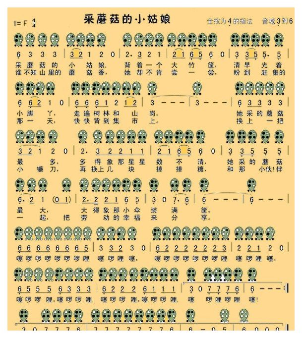 6孔埙谱【采蘑菇的小姑娘】简谱五线谱附歌词是乐器资源网于2015年11月15日 20:26:57整理更新,内容收录在陶埙乐谱栏目;乐器资源网免费分享专业、准确、规范、高清的陶埙乐谱简谱五线谱歌词等电子版资料,欢迎在线免费下载;乐器资源网无需注册会员,即可直接免费下载各类乐器学习相关资源。