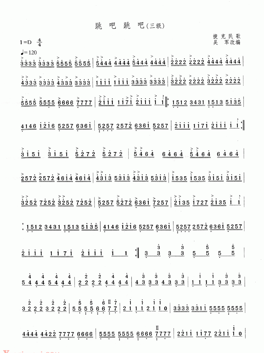 扬琴曲谱:跳吧 跳吧简谱五线谱附歌词是乐器资源网于2013年04月04日 22:25:37整理更新,内容收录在扬琴乐谱栏目;乐器资源网免费分享专业、准确、规范、高清的扬琴乐谱简谱五线谱歌词等电子版资料,欢迎在线免费下载;乐器资源网无需注册会员,即可直接免费下载各类乐器学习相关资源。