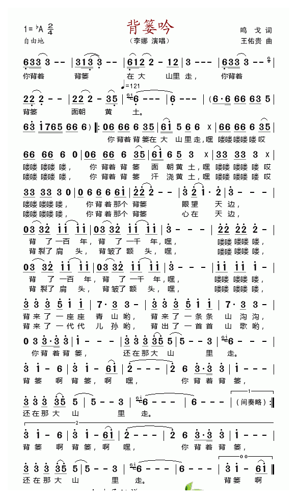 简谱【背篓吟】李娜 演唱简谱附歌词是乐器资源网于2015年06月02日 22:24:54更新的简谱大全;收录在简谱大全栏目中;乐器资源网免费分享简谱【背篓吟】李娜 演唱简谱五线谱图片,欢迎在线免费下载;乐器资源网无需注册会员,即可直接免费下载各类乐器相关资源。