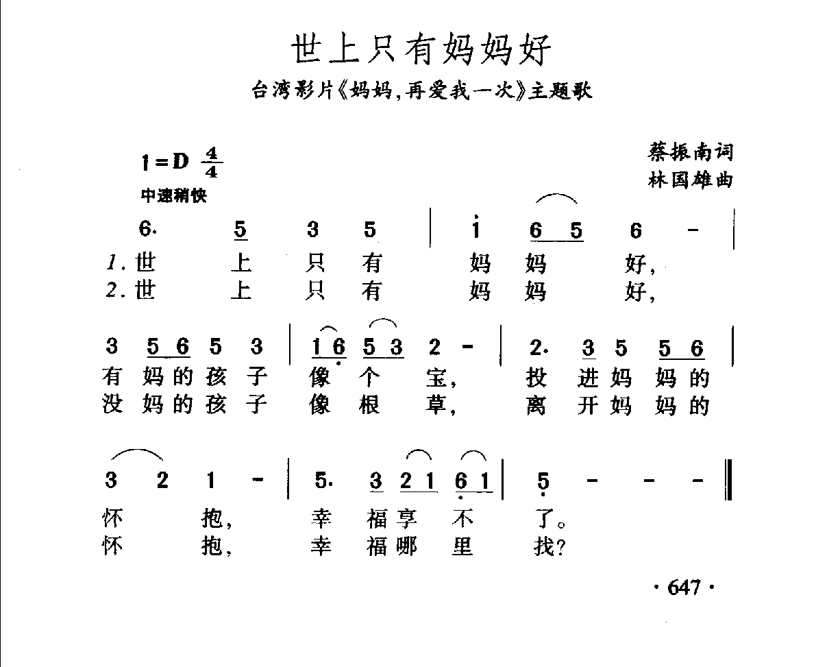 世上只有妈妈好 台湾影片(妈妈,再爱我一次)主题歌简谱附歌词是乐器资源网于2017年05月12日 09:47:35更新的简谱大全;收录在简谱大全栏目中;乐器资源网免费分享世上只有妈妈好 台湾影片(妈妈,再爱我一次)主题歌简谱五线谱图片,欢迎在线免费下载;乐器资源网无需注册会员,即可直接免费下载各类乐器相关资源。