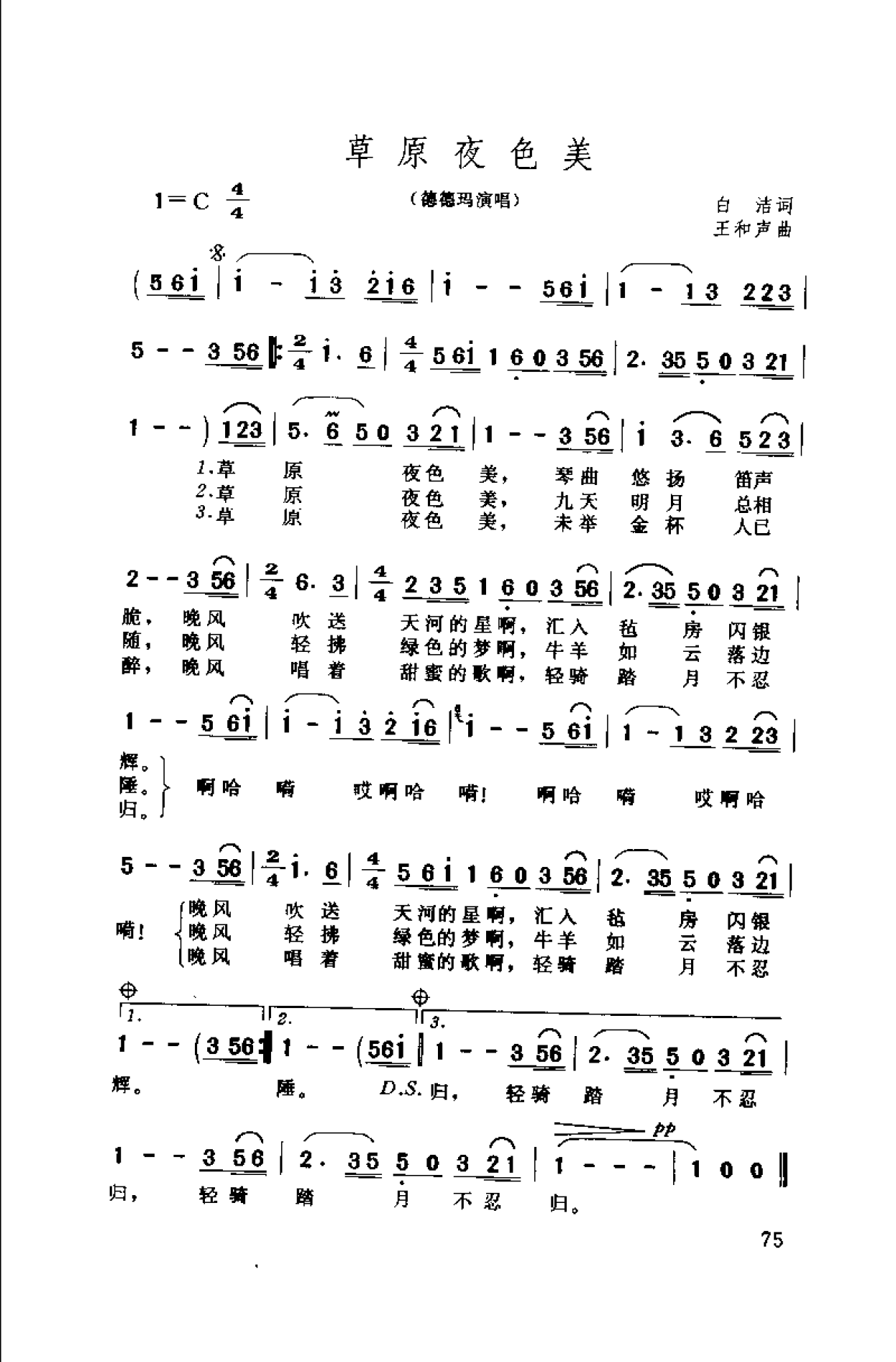 简谱:草原夜色美·1984白洁词 王和声曲(德德玛演唱)