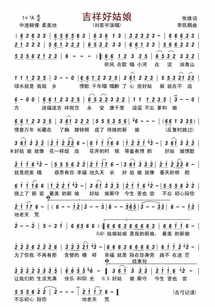 歌谱【吉祥好姑娘】简谱简谱附歌词是乐器资源网于2016年11月24日 03:25:11更新的简谱大全;收录在简谱大全栏目中;乐器资源网免费分享歌谱【吉祥好姑娘】简谱简谱五线谱图片,欢迎在线免费下载;乐器资源网无需注册会员,即可直接免费下载各类乐器相关资源。